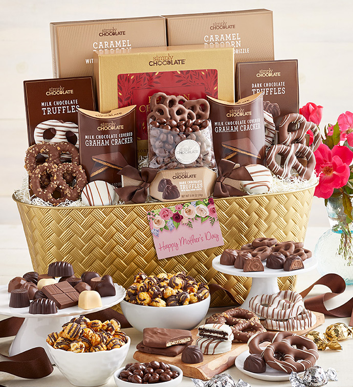 Treat Mom to a delightful selection of premium chocolates and gourmet snacks. This gift basket is packed with a variety of indulgent treats, from rich and smooth Simply Chocolate® truffles to crunchy chocolate covered pretzels and popcorn, carefully chosen to satisfy every craving. This basket is the perfect way to enjoy the finest chocolates anytime. Create a sweet new tradition for the Mom who loves chocolate.