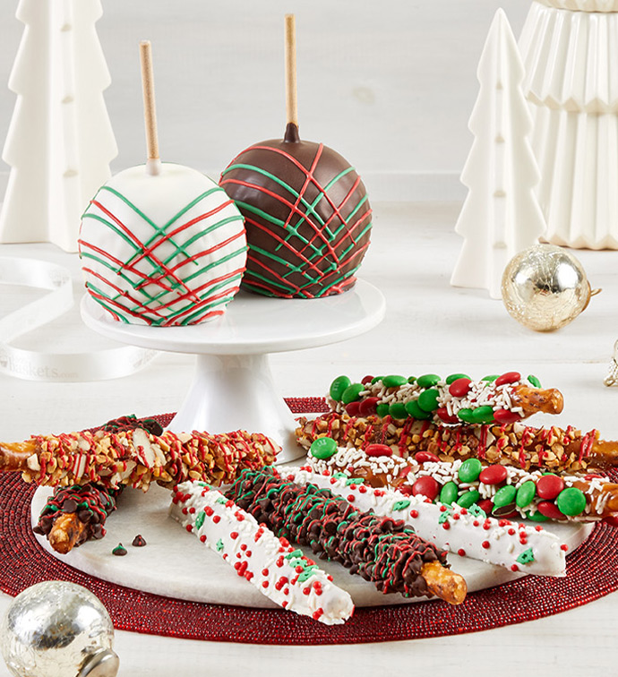 Perfect for Holiday Parties, Family Gatherings & Office Celebrations! Spread some holiday cheer with handcrafted treats that everyone will love! Each caramel pretzel rod is hand-dipped and topped with a delicious assortment of festive toppings, while our rich caramel apples are coated in decadent chocolate and finished with a cheerful holiday drizzle. Individually cello-wrapped for freshness, convenience, and easy sharing—making them the perfect sweet surprise for friends, family, or coworkers!
